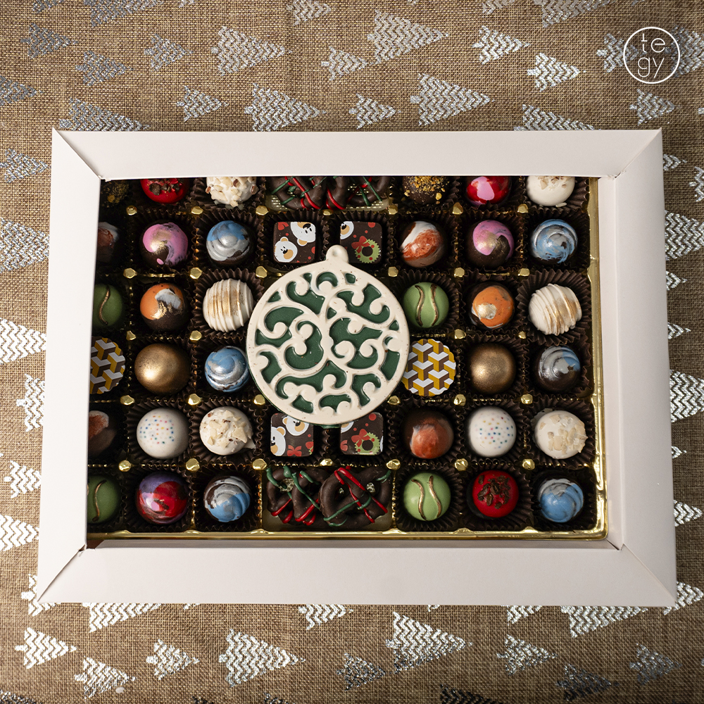 Delicado estuche con 48 piezas de chocolate surtido, incluye moño decorativo.